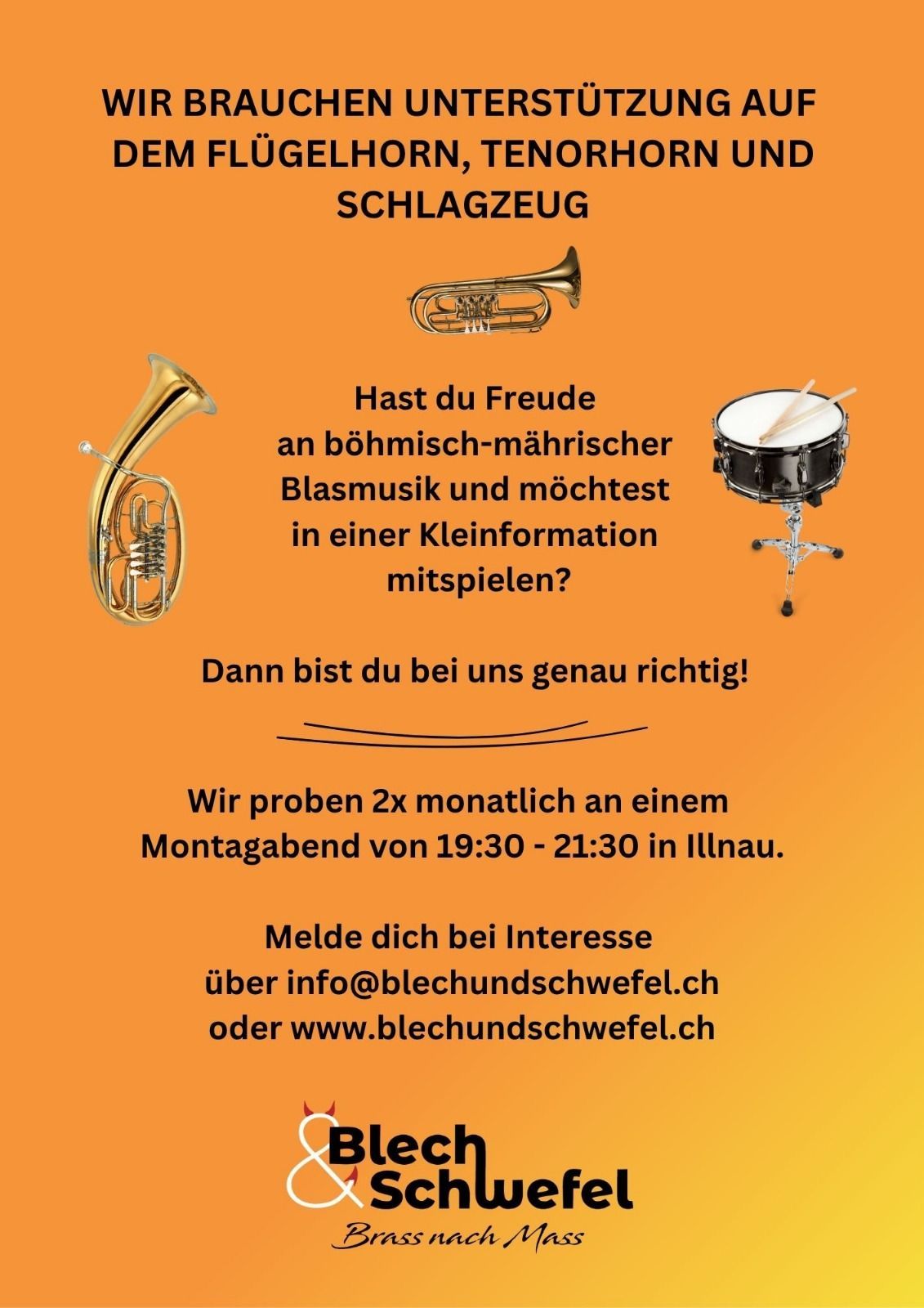 Im Frühjahr 2018 haben sich motivierte Hobbymusiker gefunden, welche allesamt die Liebe zur böhmisch-mährischen Blasmusik teilen. Schon nach wenigen Proben hatte die reine Blechformation unter dem Namen "Blech & Schwefel", mit ihrem Motto "Brass nach Mass", ihre Feuertaufe anlässlich der Bundesfeier in Seuzach. Oberstes Ziel der Musiker von Blech&Schwefel ist es, mit Leidenschaft, hoher Qualität und einem ganz besonderen Klang allen Zuhörern Freude zu bereiten.
